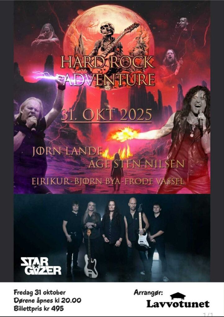 Jørn Lande, Åge Sten Nilsen, Eirikur, Bjørn Bya, Frode Vassel stiller opp og lager show. På Kråkerøy er også den flotte hardrockbandet Stargazer på menyen.