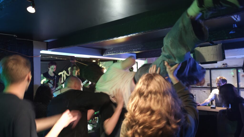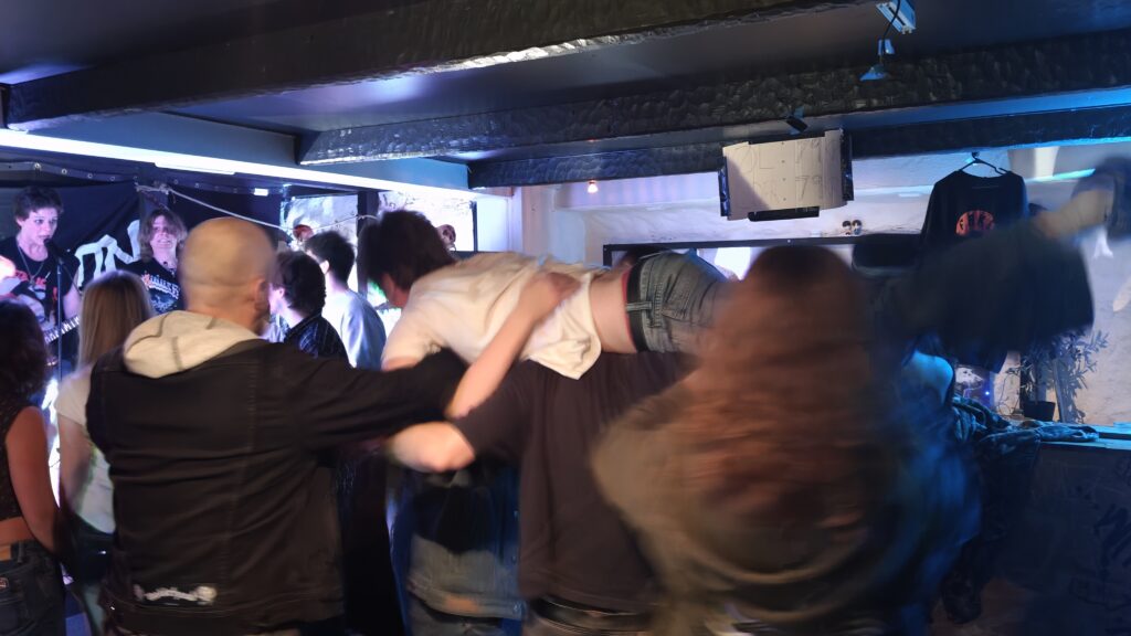 De som jobbet der var like mye med i moshpit som publikummet, spesielt en av de dro på, hehe. Veldig internt, tett, sosialt. Helt optimalt var ikke scenen, for man så ikke alle i bandet samtidig, men en god opplevelse og et rått og ungdommelig miljø. Det kom ølbokser her og der, og jeg som avholdsmann fikk halve trynet dynket i øl når det tok av med pit og slåssing. Jeg kjente øl som kom borti barten, og jeg fikk heldigvis tørket det før det dryppet inn i munnen :). Øl og konsert, det skulle tatt seg ut liksom, musikk er 100% her vettu.