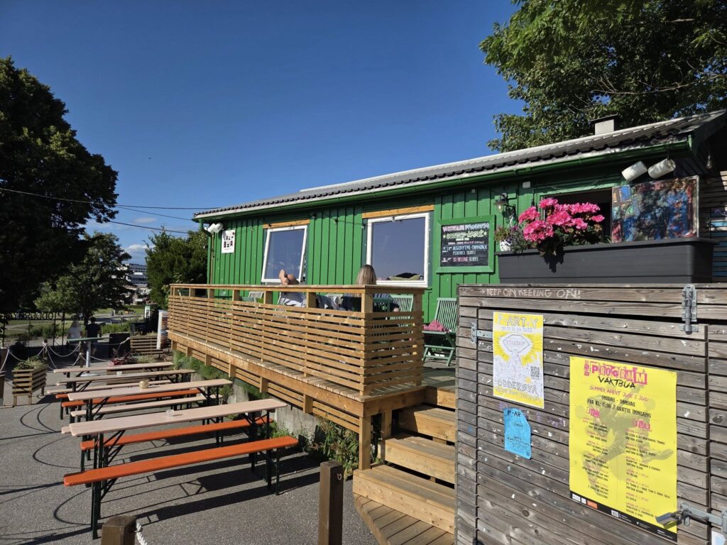 «Nå skal du høre, Yngve! Vi gjør faktisk noe litt spesielt i år og åpner utesesongen rekordtidlig på Vaktbua. Det betyr selvfølgelig at vi også tar i bruk utescenen. Vi setter opp profesjonelt telt både over scenen ute og over deler av uteserveringen, så det blir god komfort for både band og publikum – uansett vær. I tillegg får vi på plass matvogn, så man trenger egentlig ikke bevege seg bort fra Vaktbua i det hele tatt.»